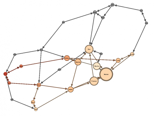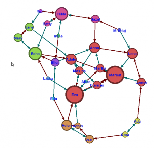 4. Wykorzystaj dodatkowe narzędzia z belki bocznej do zmiany wyglądu grafu. Pokoloruj wierzchołek Jane na czerwono i zwiększ nieco jego rozmiar. Włącz narzędzie Dragging, zwiększ promień selekcji i przetestuj jego działanie. Wyznacz najkrótszą ścieżkę między Hildą i Evą.