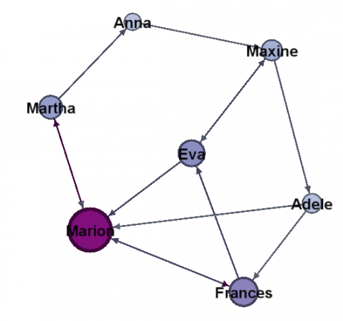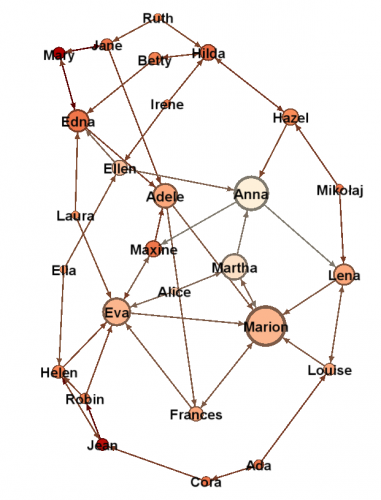 15. Krawędzi w analizowanej sieci można interpretować jako jednoznacze głosowanie wierzchołka A na wierzchołek B. W takiej sytuacji dobre przybliżenie globalnego rankingu ważności wierzchołków produkuje algorytm PageRank. Uruchom ten algorytm z prawdopodobieństwem losowego przeskoczenia do innego węzła równym 15% i progiem zbieżności w wysokości 0.001. Użyj wyznaczonej miary PageRank aby narysować sieć w taki sposób, aby wielkość i kolor wierzchołka odpowiadały wyznaczonej centralności wg. PageRank. Zidentyfikuj 5 najważniejszych dziewczyn w sieci.
